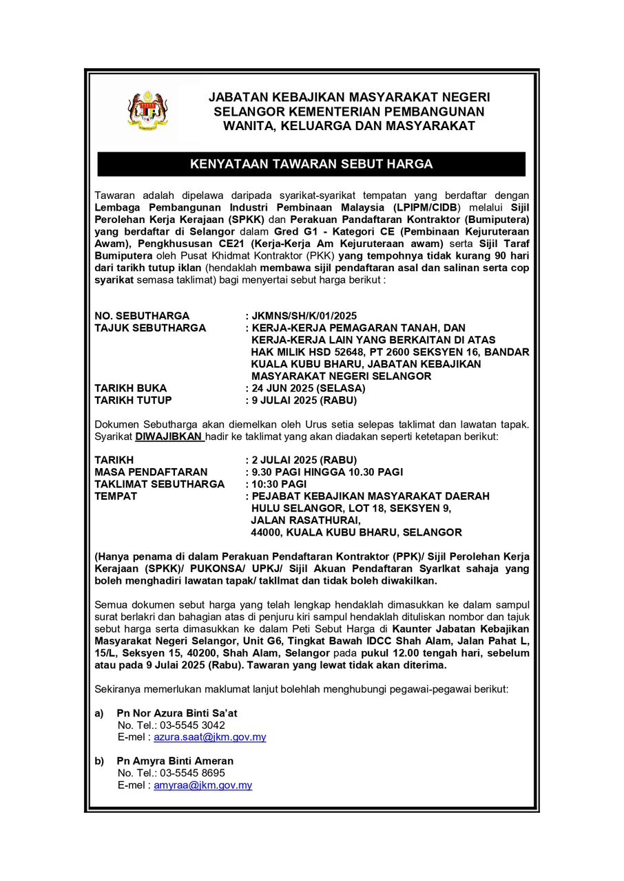 * Sila bawa bersama Sijil Pendaftaran dan Sijil Pendaftaran Kontraktor Bumiputera ASAL & SALINAN. Hanya penama di Sijil Akuan Pendaftaran Syarikat sahaja yang boleh menghadiri lawatan tapak atau taklimat sebut harga dan tidak boleh mewakilkan pegawai selain daripada penama yang dibenarkan dalam sijil.